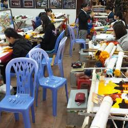 Der nächste Programmpunkt führt uns in eine Werkstatt, wo man Lackwaren hergestellt. Dünne Perlmuttplättchen werden mit robusten Scheren nach Schablonen zurechtgeschnitten und in noch weicheRead more