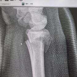 Nachdem die Wunde unter örtlicher Betäubung gründlich gesäubert und gespült worden ist, erfolgte zunächst ein Kontrollröntgen des Gelenks, das aber oB ausfiel.