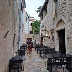 Eine Gewitterfront zieht über Kroatien. 🫣 Wir nutzten die kurzen weniger nassen Abschnitte dazwischen und wagten uns zum Abendessen ins Städtchen.