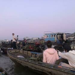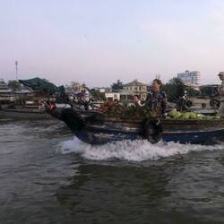 Pomaly sa rozvidnieva, užívame si východ slnka na vode a pomaly sa dostávame do zápchy lodí. Jedna naložená tonami ananásu, v druhej melóny. Občas si nás prikotví nejaký menší predajca všetkého možného a skúša o koľko dokáže ošklbať turistov s aktuálnym budgetom 2 eurá na deň.
