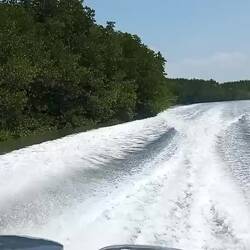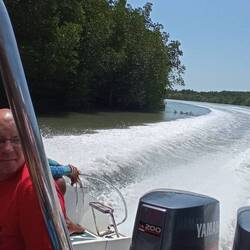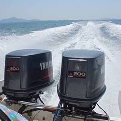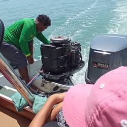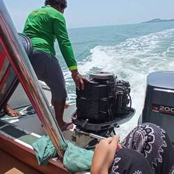 Kým ideme na jeden motor slimačou rýchlosťou, druhý sa už počas jazdy opravuje. Thajčan visí na konci člnu nad vodou. Ak rupne do vody, zomelie ho vrtuľa vedľajšieho motora. O chvíľu sa robí skúšobný štart a ozubené koleso v otvorenom motore sa pri jeho pohyboch zopár krát točí tesne vedľa šiat opravára. Malý pohyb a zomelie ho :) So záujmom túto opravu (ako vlastníci takmer rovnakej Yamahy :) spolu s Ňaňom sledujeme z tesnej blízkosti.