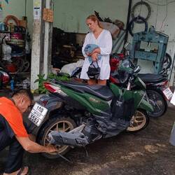 Naše celodenné plány preruší riadny lejak, ktorý s prestávkami trvá zopár hodín. V tomto daždi na motorke to bol fakt zážitok. Stihli by sme to pred dažďom, ale mali sme defekt na motorke - no zábava navštíviť thajský motoservis. Má to veľkosť dvoch garáží, bordel tam je väčší ako v mojej dielni, ale stroje tam majú, žeby nanovo vyrobili aj kozmickú loď. Samotné motorky sa opravujú šmarené na zemi s preskakovaním všemožného náradia a rôznych súčiastok po zemi pohodených.