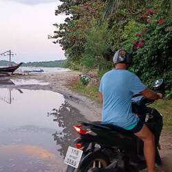 Inak po jazde na motorke v riadnom lejaku sme kvalitne premočení a to sme tu v období sucha, keď nemá padnúť ani kvapka. V skutočnosti je okolo celého ostrova čierňava a počasie vôbec nepôsobí tropicky. (Maja nesúhlasí, celý deň sa ma snaží zhypnotizovať, že počasie je perfektné).