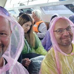 Výlet totiž začína raňajkami ešte pri móle kde... leje... Keď konečne príde čas presunúť sa do lodí, ktorými pôjdeme na ostrovy, zisťujeme, že v plne plátnom ostrieškovaných lodiach prší tiež. Ochhh. Je to trápenie v podobe 1,5h plavby na rozbúrenom mori zabalení v pršiplášťoch, kde na nás prší aj zhora aj spredu...