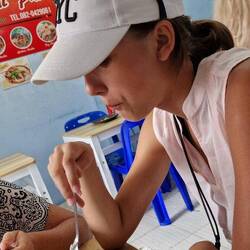 Inak ten klobúk, čo má Danka na hlave nám tetuška vysvetlila, že je to miska, z ktorej sa je, ryža :)Les mer