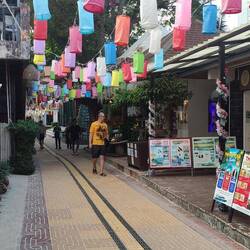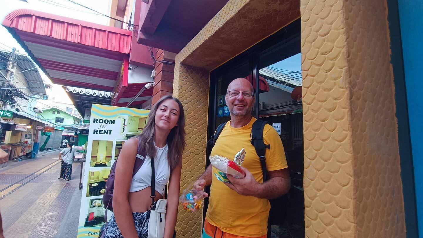 Hneď po pristáti sa moja obava potvrdzuje. Stovky ľudí sa tlačia na móle a uličkami prepchatými ľudskými telami sa predierame do nášho ubytovania. My máme ubytovanie blízko, v centre a s "parádnym" balkónom a výhľadom rovno do thajskej tržnice. Viď. foto.