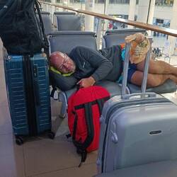 Už sa tešíme na naše sedadlá v lietadle. Stoja pri nás nejaké vyššie sily, ktoré zariadili, že tí, čo stále zneužívajú dozvuky z narodenín (teda ja a Danka) majú sedadla pri východoch - t.j. cca 2 metre na natiahnutie nôh. V rámci našej triedy je to to najexkluzívnejšie, čo môžeme mať.