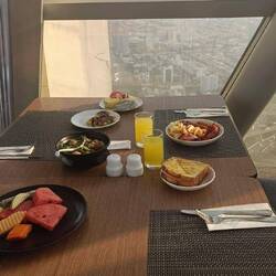 Hotel sa podľa poschodí delí na zóny. Najvyššia zóna sa volá "Space zone", tak preto raňajky vo vesmírnej zóne.Les mer