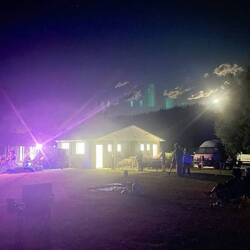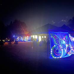 Am frühen Abend bin ich zu einer Gruppe von Backpackern dazugestoßen, die auch nur zufällig auf dem Festival gelandet sind. Gemeinsam haben wir geholfen ein Banner mit Schwarzlichtfarbe zu bemalen.