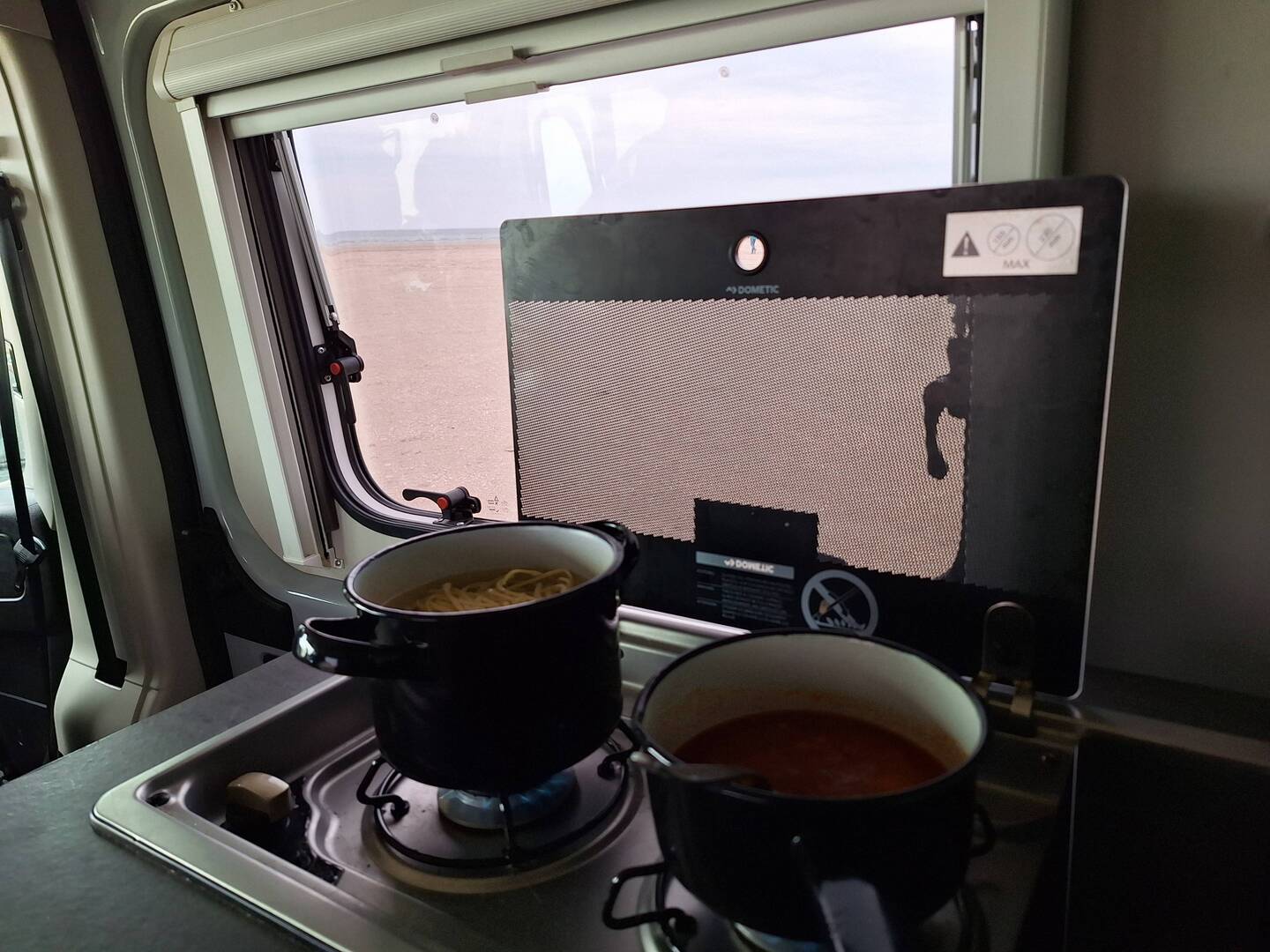 Nach einem abenteuerlustigen Einkauf fuhren wir mit unserem Camper an den Strand von Rømø um dort Mittag zu machen. Es gab Nudeln mit Bolognese. Praktisch das man seine Küche überall dabei hat.もっと詳しく