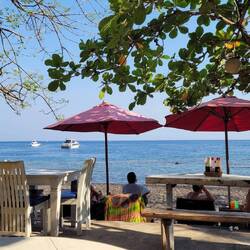 Schon nach der Ankunft stellt sich heraus, dass es nur wenige Restaurants in Gehnähe hat...und diejenigen, welche existieren sind nicht immer offen. Wir mussten also einen Roller mieten und kurvten bis zum Dorf etwa 5 Minuten entfernt. Ohne Roller geht nichts auf der Insel.