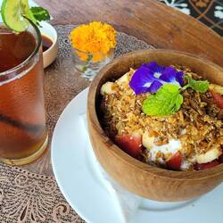 Natürlich besuchte ich gleichentags Tirta Gangga, eine grosszügig gestaltete Wassergarten-Anlage mit unzähligen Skulpturen, Brunnen und Blumen. Diese wurde für einen der letzten balinesischen Herrscher erbaut bevor dieser durch die Europäer entmachtet wurde. Eine Wohlfühloase. Touri-Falle...nein, noch nicht. Später ging ich ins Warung (Restaurant) zur Schwester meines Homestays was essen.