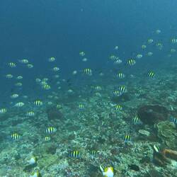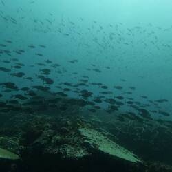 Wow, ich sage euch, es war eine Wucht. Wiederum so schöne Korallengärten und so viele Fische, dass man nicht mehr wusste, wo man hinschauen soll. Die starken Strömungen waren herausfordend und wir mussten konzentriert und nahe beieinander bleiben. Das Wasser, gerade im Vergleich zu den bisherigen Tauchorten, ar***kalt. Man taucht, dann flimmert das Wasser und plötzlich wirds kalt...eine Strömung von tief unten, die es nach oben zieht. Als ob man in eine andere Wasserschicht taucht. Ich habe so gezittert, dass ich keine Fotos mehr schiessen konnte. Dann war mir auch klar, weshalb hier mit 5mm Tauchanzügen getaucht wird. Es ging jedoch allen gleich...alle haben gezittert als wir wieder auf dem Boot waren. Jemand sagte dann, sein Tauchcomputer zeige ihm 16 Grad an... iiiih!