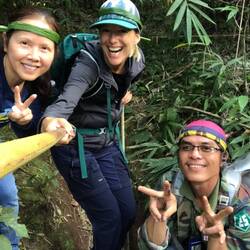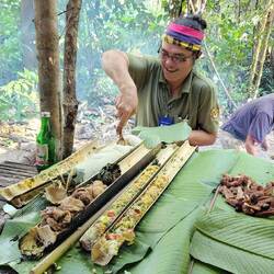 Endlich kamen wir an einem einfachen Unterstand mit Feuerstelle an - mitten im Urwald. Es war nun Jungle-Cooking-Class angesagt. Und ich muss sagen, ich bin begeistert. Wir haben Klebreis, Gewürzpoulet und Rührei mit Kräutern, Zwiebel und Tomate in Bambusrohren über dem Feuer gegahrt. Dazu knusbriges Schweinefleisch am Spiess. Gegessen mit den Chopsticks auf Bananenblättern. Ja, der Guide ist wahrlich ein Jungleman. Aus selbstgefertigten Bambus-Shotbechern gab's noch Reiswein. Gegessen haben wir letztlich um 15Uhr. ;-)