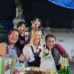 Es war so, dass ich bereits am ersten Abend nach dem Nightmarket im Quartier vergebens eine Beiz für einen Schlummi gesucht hatte. Irgendwann blieb ich auf einer Strassenkreuzung stehen und überlegte, welche Richtung ich wohl einschlagen sollte, als ein paar Locals fragten, was ich suche. Meine Antwort war "Bier". Und schon winkten sie mich rüber und erklärten, sie hätten welches, ich solle mich doch setzen. Sie selbst, ein Grüppchen älterer Thais, hatten alle schon bedenklichen Seitenschlag vom Whiskey, der überall rumstand. Am nächsten Abend fand ich mich nach dem Abendessen erneut ein, diesmal war noch ein aufgeschlossenes Portugiesenpäärchen dort, mit denen ich sofort gute Gespräche hatte. Abend Nummer 3 hatte der Hausherr namens Tu seinen 50. Geburtstag. Die schrägen Gesangstöne der Karaokesinger waren bereits von weitem hörbar. Der Abend ging so lange und so laut weiter bis eine Polizeipatrouille wegen Lärmbelästigung auftauchte. Die Party war dann sofort für beendet erklärt.