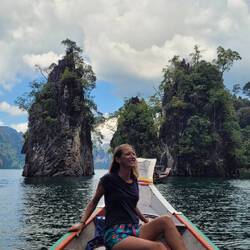 Der Khao Sok NP liegt, sofern man aufs Boot steigt, etwa 2 Autostunden von Khao Lak entfernt. Zuerst machten wir einen Halt beim Emerald Pool. Von einem Dschungel umgebenen, künstlich angelegten Wasserlauf, kann man im kühlen Quellwasser baden und mit einfachen Kanus befahren. Danach ging's zum Staudamm des Sees Ratchaprapha in Khao Sok. Im Longboat hat man eine herrliche Fahrt auf dem zerklüfteten See, umgeben von Bergen und Kalksteinfelsen. Es war atemberaubend! Wir hatten Zeit für einen Sprung ins angenehme Kühl und in einem der schwimmenden Hotels gab es Mittagessen.