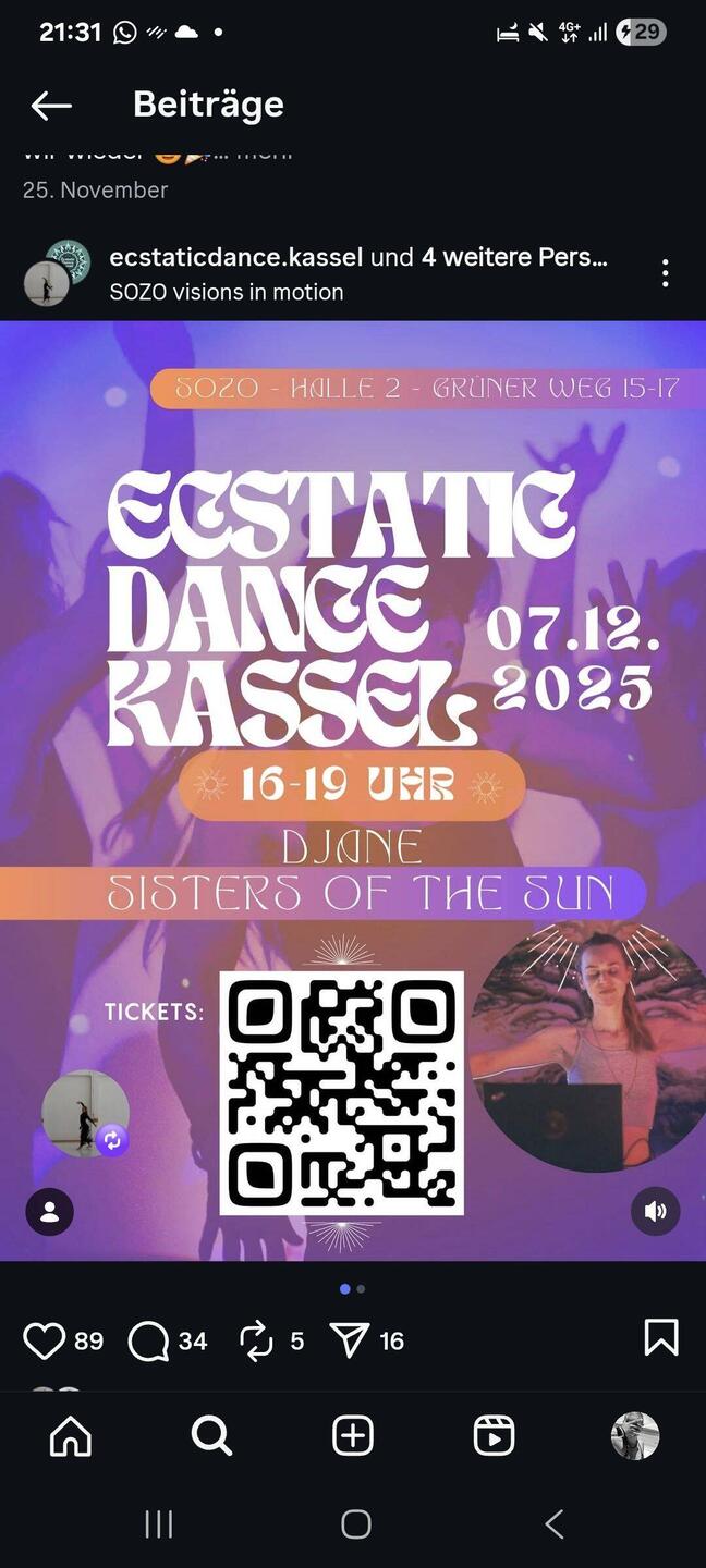 Ecstatic Dance Kassel, wie sowohl die Gruppe als auch die Veranstaltung heißt, hat erstmals am 24. Oktober 2025 im Tanzstudio Sozo Visions im Grünen Weg der Innenstadt Kassel stattgefunden. Das erste Mal sogar mit noch mehr verkauften Tickets als diesmal, einem größeren Raum und bereits vollem Erfolg. Obwohl bereits mit dem Orgateam in Kontakt konnte ich wegen meiner psychischen Labilität dort leider nicht sein und war umso freudiger, dass ich mich diesmal physisch und psychisch voll darauf einlassen und kommen konnte. Aber eigentlich kam die Veranstaltung fast eher zu mir als ich zu ihr. Dem Universum und neu entfesselter Manifestationskraft sei Dank kam die zu mir. Nachdem das Helferteam diesmal voll war und Trieyah, die Gesang Support war, keinen Gästelisten Platz für mich hatte, war ich mehr als bereit ganz gewöhnlich ein Ticket zu kaufen. Diese starten bei 15€ was bei einer 3h Veranstaltung echt viel klingt, ist aber bei der erhöhten Achtsamkeit und dem bewussten Leben feiern jeden Cent wert, zumal die 3h sich länger oder tiefgehender anfühlen.