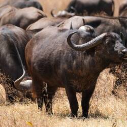 Die männlichen Büffel sind schwarz, die weiblichen leicht bräunlich. Sie haben so gut wieLæs mere