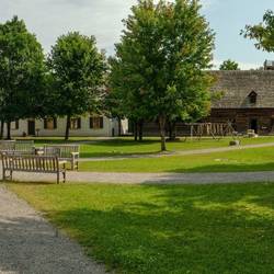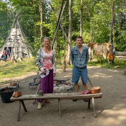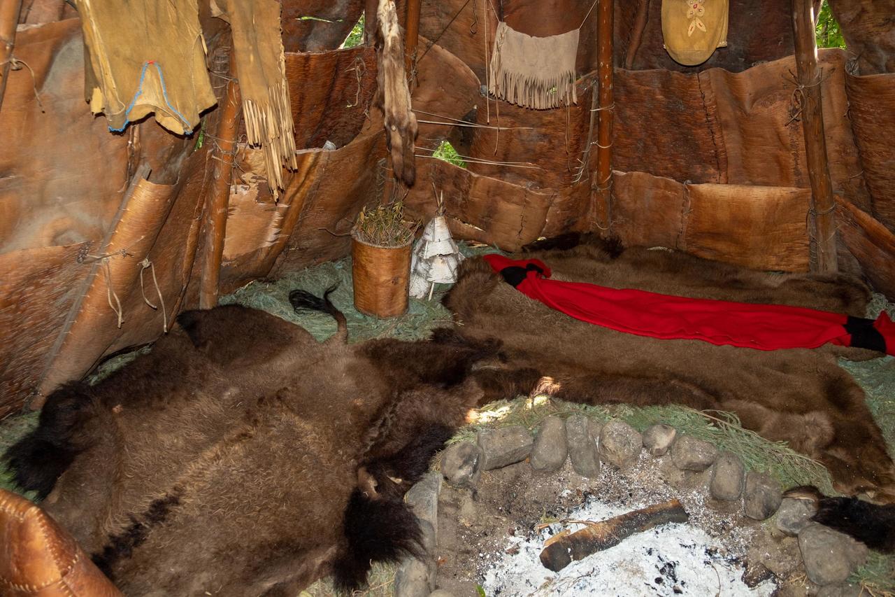 Am coolsten war das Indianerzelt, dass original nachgebaut wurde und in dem es bis -30° angenehm warm bis heiß ist. Das hat der "Indianer" (siehe Foto) im Winter selber ausprobiert. Es ist mit Moos gedämmt und mit Tannenzweigen ausgelegt, damit sich keine Schlangen und andere ungewollte Kleintiere einnisten. Es ist ihnen zu stachelig. Die Zweige bringen auch noch diesen frischen grünen Waldgeruch, der den starken Feuergeruch etwas überdeckt. Das Leben in den Zelten war doch um einiges komfortabler, als ich es mir vorgestellt habe. Sie hatten sogar rund um die Uhr warmes Wasser, da sie den Wassertank immer in der Nähe des Feuers stehen hatten.
