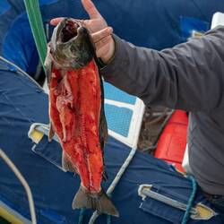Heute Abend fing Marcus einen weiblichen Lachs und uns kam die glorreiche Idee die Lachseier zu probieren. Roh trauten wir uns nicht, also brieten wir sie in der Pfanne an. Aber ehrlich gesagt,Leer más