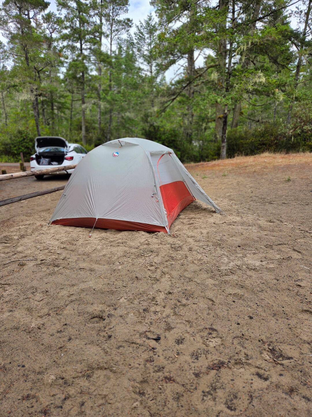 We vertrekken vroeg voor een lange rit. Eerst slingeren we via haarspeldbochten naar beneden, om kilometers verder weer omhoog te klimmen richting Kings Canyon en Sequoia NP. Onderweg zien we gesloten campings, maar gelukkig is de lodgepole campground open.De tent wordt meteen opgezet, en het weerbericht gecheckt: regen en amper 7 graden overdag. We besluiten slechts één nacht te blijven in plaats van 2 en de volgende dag naar een hotel te rijden. Na vijf dagen in rook en zonder douche klinkt dat als een verademing.