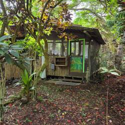 We rijden naar Johanna’s Garden, een fruitbedrijf in het zuidoosten van het eiland. Vanaf de luchthaven gaat de route door eindeloze lavavelden en drie uur later komen we aan. We krijgen meteen wat vers fruit mee: passievrucht, bananen, sinaasappel en stervrucht. Het smaakt allemaal veel zoeter en sappiger dan we gewoon zijn. Ik vind ook nog een groene kokosnoot en met behulp van YouTube en een machete krijg ik die open.