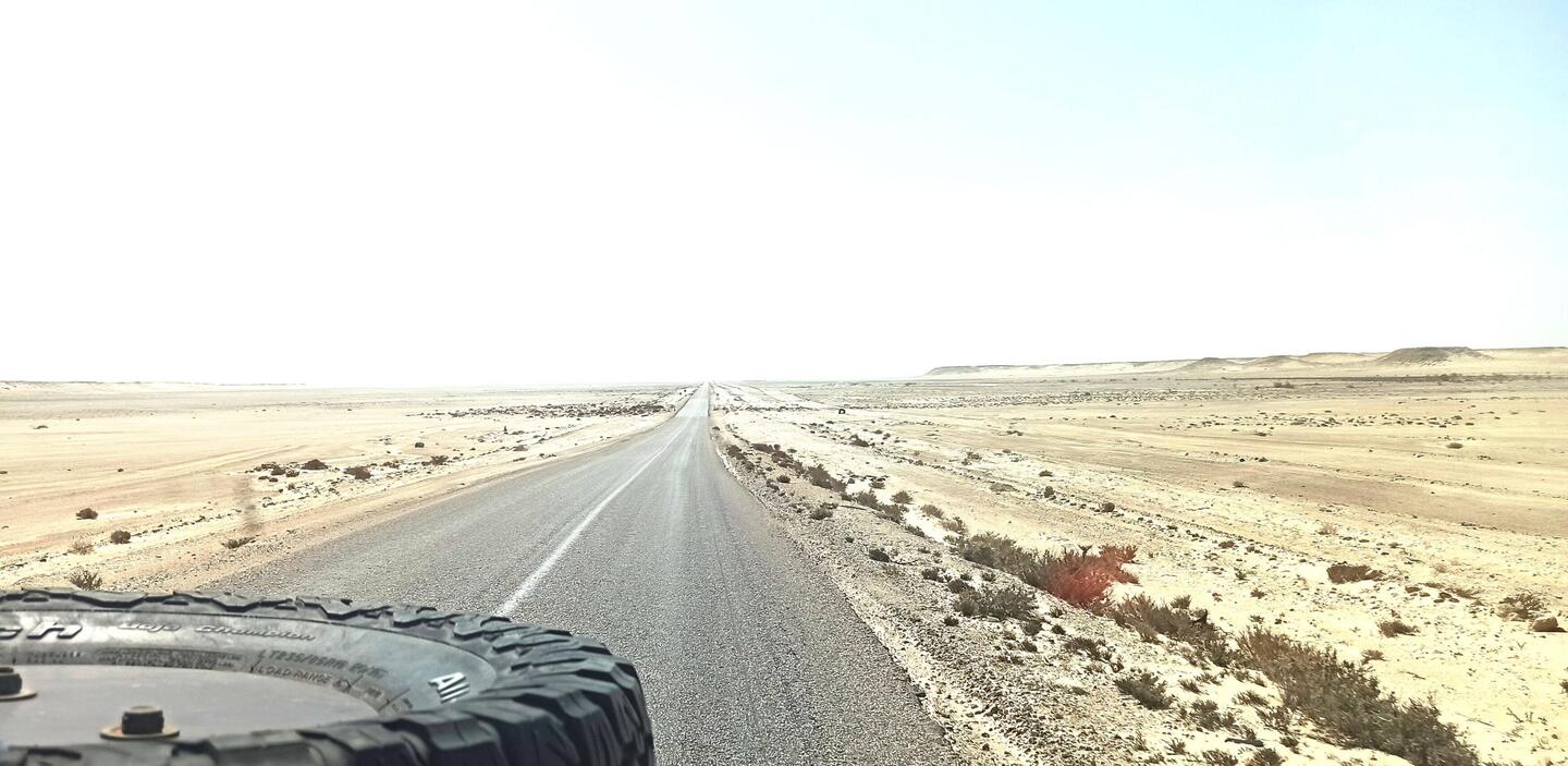 Hinter Daklha wird die Route N1 deutlich schlechter. Endlos geht es geradeaus. In der Ferne sehen wir Dünen und Tafelberge. Dann haben wir die Grenze Marokkos zu Mauretanien erreicht.