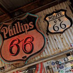 C'est un petit village qui fut autrefois prospère lors de la ruée vers l'or mais qui est aujourd'hui plutôt un village fantôme. On y trouve bien-sûr une petite rue principale où on a ouvert quelques boutiques pour les touristes mais sinon, c'est assez mort comme endroit. Les ânes qui étaient utilisées dans le temps ont depuis été relâchés et se promènent librement dans les rues, aux côtés des nombreux touristes! Tout est sur la thématique ancienne et on voit même une mise en scène sur la rue principale, deux gars qui sont en duel! Plutôt cocasse. Nous faisons quelques boutiques et nous arrêtons prendre une crème glacée. Cet endroit est d'ailleurs plutôt spécial car il serait semble-t-il hanté! Le bar et le restaurant adjacents ont les murs couverts de billets de 1$! Les visiteurs qui viennent peuvent inscrire leur nom sur un billet et le coller au mur. Très cool! Il y en a partout partout dans le bar!!!! Par la suite, nous retournons tranquillement au camper puis on reprend la route. Nous arrêtons à une petite station service, vraiment typique de la route 66 avec des vieilles voitures, machines à coke et autre vieux objets. Ce n'est plus une station service mais seulement un dépanneur maintenant. Nous y prenons quelques photos puis on repart.