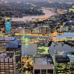Für den letzten Abend in Australien hatten wir uns etwas Besonderes ausgesucht. Ein Abendessen im Drehrestaurant im Sydney-Tower. Wir fuhren mit dem Fahrstuhl auf 240m Höhe. Abgestürzt war nur der Rechner für die Anzeige im Aufzug. Sicher kamen wir oben an und genossen parallel das umfangreiche Buffet und die Aussicht. Rotwein und Whisky durften auch nicht fehlen.