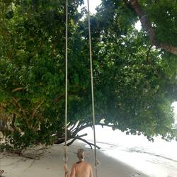 Wir schwimmen im Wasser. Palmen hängen quer über den Strand und dienen als natürliche Schattenspender. Als Ralf sich umdreht und zum Strand schaut. Springt er ins Wasser und schwimmt auf Ralf zu. Liebe auf den ersten Blick. Der schwarze große Hund sitzt auf Ralfs Oberschenkel und genießt die Krauleinheiten. Er kennt uns nicht. Aber ist direkt zu uns gesteuert und hat Ralfs Nähe gesucht. Immer wieder schwimmt er zum Strand, sucht dort Fische und schwimmt dann zu Ralf um auf seinem Schoß eine Pause zu machen. Es ist so süß.