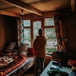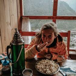 Wir sind anfangs die einzigen Gäste und sie gibt uns einen Raum mit dem einzigen Fenster in der Dachschräge. Ich bin so dankbar dafür, denn das einzige was mir wirklich jede Energie zieht, sind dunkle, kleine Räume. Dieser hier ist alt, etwas schmuddelig, aber hell und die Bettwäsche und Decken weich und warm. Die beiden Frauen sind sehr nett und machen uns direkt eine Suppe und gebratenen Reis zum Mittag. Wir sitzen in der Sonne. Die einzige Sonne in Charme, denn nur hier kommt die Sonne an den Bergen vorbei. Und ich wärme mich auf. Immer noch spüre ich diese Übelkeit und mein Husten bricht nach und nach noch stark raus.
