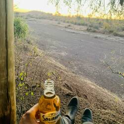 We wandelden terug naar de boomhut om van de zonsondergang te genieten met wat drankjes en gesprekken. Het was een geweldig moment om dieren te proberen spotten kijkende over deze rivieroever. Nu terug naar huis met een jeep rit in de duisternis. Mmushi hielp ons dieren te spotten met behulp van zijn enorme zaklamp, zodat we toch enkele dus giraffen, antilopen en jakhalzen zagen.