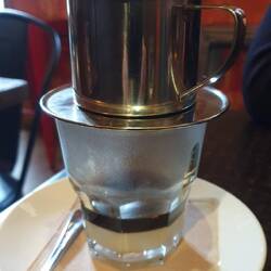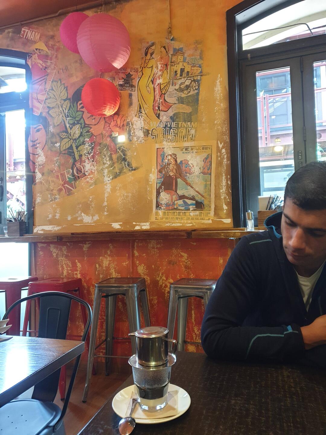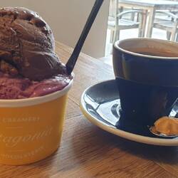 trop tôt pour une glace, David se prend un bon café chez Patagonia
