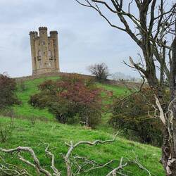 We've climbed up and down some beautiful valleys and through fields of winter crops, passing through Fish Hill and up to Broadway Tower. This tower is said to be the highest point in the Cotswold. It was built in 1798 for the 6th Earl of Coventry (allegedly as a folly for his wife). This was a good stop for tea and a snack. The downhill to Broadway village was painful on the knees!