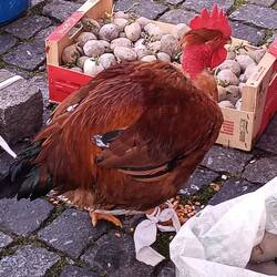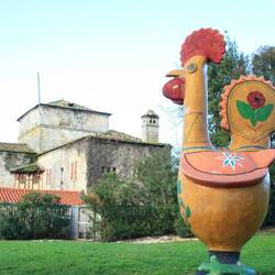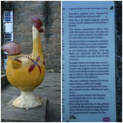 Kurzfassung: ein Pilger würde eines Verbrechens beschuldigt. Einfach, weil er ein Fremder war. Der verurteilte Pilger forderte ein letztes Gespräch mit dem Richter. Dieser war gerade dabei, ein Hähnchen zu essen - worauf der Pilger weißsagte, daß dieses Hähnchen bei seiner Hinrichtung lebendig werden würde, wenn er unschuldig ist. Der Hahn würde lebendig und die Unschuld war bewiesen - die Hinrichtung wurde gestoppt. Der Hahn ist heute u.a. ein Symbol für Gerechtigkeit.