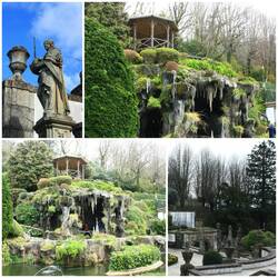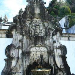 Das Heiligtum ist ein interessantes Beispiel für einen Wallfahrtsort. Das markanteste Merkmal sind die barocken Monumentaltreppen, die über einen Höhenunterschied von 116 Metern führen. Durch diese Treppen und mit der Bergterrase gilt das Heiligtum als schönste Wallfahrtskirche in Portugal. Ich lasse es mir nicht nehmen, die gesamte Strecke vom unteren Parkplatz aus zu laufen und mir auf dem Weg die einzelnen Kapellen, in denen Szenen von der Kreuzigung dargestellt werden, anzusehen. Durch die lebensgroßen Figuren vor Landschaftsmalereien an den Kapellenwänden wirken die Szenen eigenartig echt und teilweise sehr kitschig. Die gesamte Anlage ist gut restauriert und die früheren Gästehäuser sind heute (Tagungs-)Hotels. Der Park ist nett gestaltet - etliche Pickniktische laden (bei gutem Wetter) zum Verweilen ein. Auf den Hinweisschildern ist "See" und "Boote" ausgeschildert... Hier oben? das muß ich mir näher ansehen. Der "See" entpuppt sich als künstlicher Teich (mit Betonwänden), auf dem man -vermutlich im Sommer, denn jetzt ist das Wasser abgelassen- mit kleinen Kanus herumpaddeln kann. Naja - es paßt zu den künstlichen Grotten, und "Teehäuschen", die es auch auf dem Gelände gibt. Für mich mal wieder ein typischer Fall von "so kann man es auch beschreiben"... 😉
