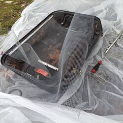 Heute ist "Bastelstunde" angesagt. Das Wetter ist besser als erwartet (eigentlich sollte es von 10-17 Uhr regnen) und ich bekomme in dem kleinen Baumarkt hier im Ort etwas Drahtgeflecht, um die Innenseite der Motorhaube zu stabilisieren.