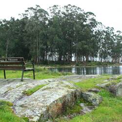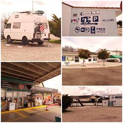 Der Stellplatz liegt hinter einem undurchsichtigen Eisenzaun, ist aber so wie beschrieben. Ich gehe durch die kleine Tür und sehe mir den Platz erstmal an. Kurze Zeit später kommt die Platzbetreiberin, erklärt mir in einem Englisch-Spanisch-Zeichensprache-Mix alles und öffnet mir das Einfahrtstor. Obwohl es mit der Verständigung etwas hapert, verstehen wir uns recht gut und sie ist wirklich sehr rürig. Sagt nichts über meine Rangier-Aktionen (ich will einerseits gerade stehen, andererseits die Keile nicht herausholen und darüberhinaus auch noch die schlimmsten Matsch-Stellen meiden) und erklärt mir dann noch, wie ich zu Fuß den Weg „into town“ abkürzen kann. Naja, ob ich heute noch einmal rausgehe, weiß ich nicht. Ich bin mittelprächtig naß und -bedingt durch den böigen Wind- ziemlich durchgefroren. Dabei ist es eigentlich gar nicht kalt. Also erstmal etwas Trockenes anziehen, Woll-Cape und Woll-Decke heraussuchen und Tee kochen. So langsam geht’s mir besser und gegen 16:30 hört es tatsächlich auf zu regnen. Also doch noch ein Spaziergang in den Ort. Er ist ganz nett, aber dass die Geldautomaten auf einmal Gebühren nehmen, finde ich gar nicht gut. Naja, für eine Nacht Platzgebühr reicht mein Bargeld noch (Kartenzahlung geht dort nur im Sommer).
