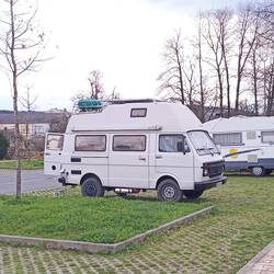 Am Morgen ist es wirklich etwas trockener - heißt es regnet mal nicht durchgängig. Ich räume den Beifahrer-Bereich leer, baue den Sitz aus, öffne die Motorhaube und... habe Glück: ich habe scheinbar gestern Abend schon nahezu alle Flusen der Motorhauben-Dämmung herausbekommen. Der Motor sieht gut aus - nur ganz unten ist er sehr leicht ölfeucht. Und noch einmal habe ich Glück: das Wohnmobil aus Bremen wird von 2 Frauen gefahren, von denen eine KZF-Meisterin ist. Sie ist ohnehin am LT interessiert (ihr T5 ist gerade im Aufbau) und erklärt sich bereit, einen Blick in den Motor zu werfen. sie beruhigt mich, gibt "grünes Licht" und gibt mir ein paar Tipps, wie ich die leicht zerfledderte Dämmung besser befestigen kann, damit nichts im Zahnriemen landet. Im Ort gibt's einen kleinen Baumarkt - da werde ich morgen mal nach "Reparaturmaterial" suchen.
