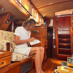 Feb 22- Bernie arrived at noon. We lowered the dinghy to test the outboard and ended up rowing all the way back from Old Town, as it died and we couldn’t get it started. Walked to Old Town… went to book store. Bernie made fajitas.. so good!