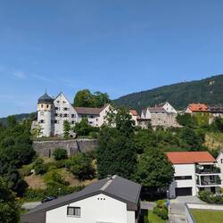 Der Bus, der vor dem Hotel abfuhr, hatte 5 Minuten Verspätung, also alles wie zu Hause 🤣. Nach 5 Minuten Busfahrt war ich in Langen, wo auch der ICE hält. Allerdings bin ich erstmal mit dem RailJet gefahren. Das hatte den Vorteil, daß ich in Bregenz ca. 40 Minuten zum Umsteigen hatte und damit etwas Zeit, um mir ne Kleinigkeit zum Essen zu holen. Naja, zumindest theoretisch. Zwei Fußgängerampeln mit ewiger Rotphase, außer einem sehr fragwürdigen Imbiss gab's eigentlich nix weiter. Zum Glück tauchte noch eine Bäckerei mit belegten Brötchen auf.