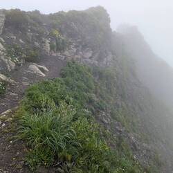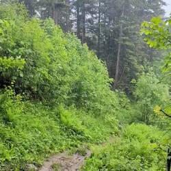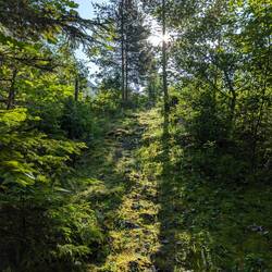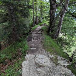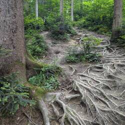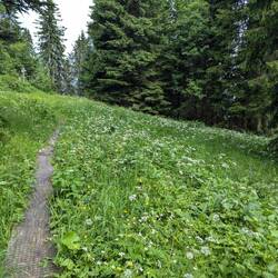 Vor allem die zweiten 500 Hm hatten es in sich. Erst die alte Skipiste hoch ... und es fing an zu tröpfeln. Regensachen hätten sich aber nicht gelohnt, da ich eh komplett eingeweicht war. Die Anstrengung und die Schwüle ... . Die Luft war zum Schneiden. Nach der Skipiste in den Wald. Dort am Steilhang über Wurzeln und z.T. mehr als kniehohe Holzstufen.