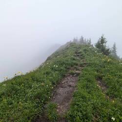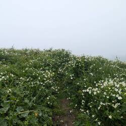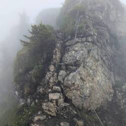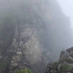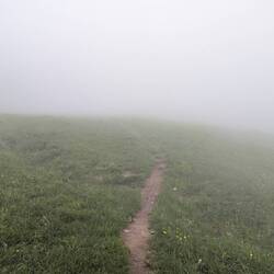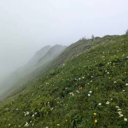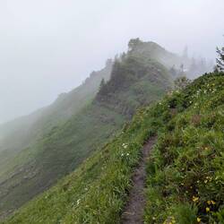 Am Losenpass in Bödele bot sich ein Buswartehäuschen für den Rest des Lunchpaketes an. Gerade hingesetzt, zogen plötzlich Wolken über den Pass und die Sicht wechselte immer so zwischen 50 und null Metern. Nach dem 2. Frühstück ging es dann weiter. Es war etwas kühler und windiger, aber so erträglich, dass die Jacke erstmal noch im Rucksack blieb.