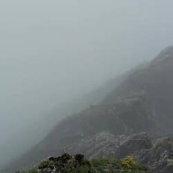 Ich stand ja nun in der matschigen Wiese, zwischen den Sträuchern und Felsklötzen. Eine von den schon überholten kam ganz langsam aber sicher weiter auf mich zu. Den Kopf so unten und mich direkt im Visier. Keine Ahnung, vielleicht lag es auch an meinem Outfit mit dem roten Gamaschen, dem leuchtend blauen Regenschutz vom Rucksack und dem am Rucksackgurt befestigten Regenschirm. Tja und jetzt? Da die anderen das Interesse an mir verloren hatten, bin ich ganz langsam, ohne meinem Verfolger direkt in die Augen zu schauen, unter beschwichtigendem Gemurmel zurück in Richtung Straße.