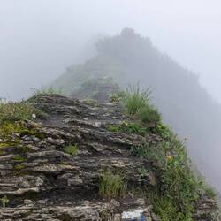 Ich wollte spätestens 05:30 starten. Also Wecker auf 04:30 gestellt. Da ich der einzige Übernachtungsgast war, war das auch komplett stressfrei mit Rucksack packen, Gemeinschaftsbad und so. Irgendwie war es dann doch 05:40. Der Morgen war total mild, fast warm, aber ziemlich schwül. Es war immerhin so hell, daß man keine Stirnlampe brauchte.