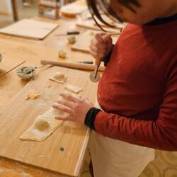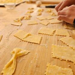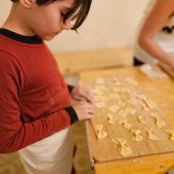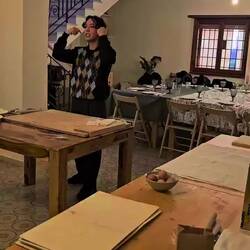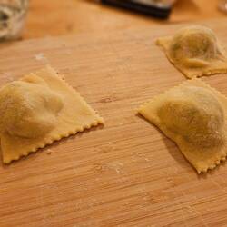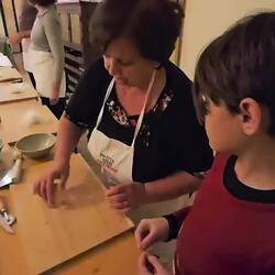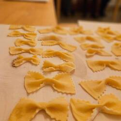 We spent about two hours learning the secrets of pasta making from Nonna Margie. She was a hoot. Lilli translated for us. We made farfalle (bow-ties) and ravioli, while she rolled out a huge sheet ofBaca lagi