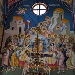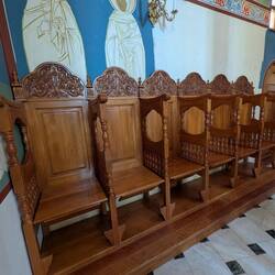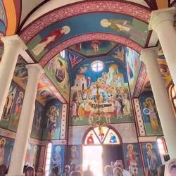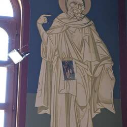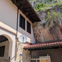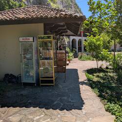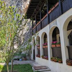 The frescos in this Eastern Orthodox church just below the rock monastery are so bright and beautiful! You can see the ones that are outlined with their final plan taped to them.