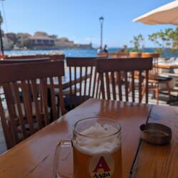 Back on the tarmac and it was now time for the beach. By now we were in the south of the island and the next stop due south was Libya. We arrived just before midday and I had a swim and then we had a beer overlooking the beach before having lunch with the rest of our party served at beach side taverna. Greek salad, tzatziki, pork chicken and bread were served along with a small beer.