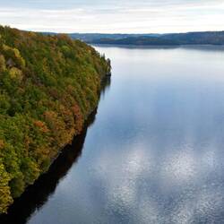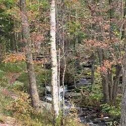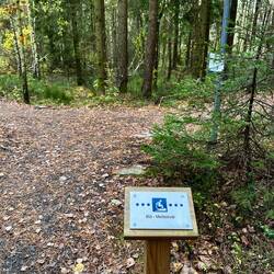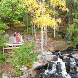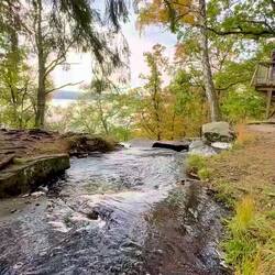 Afinal o parque também serve de estacionamento a um parque de merendas que alcançámos com uma curta caminhada — muito bem identificada e com acesso para deficientes (!!) — percorrendo uma trilha que segue um pequeno ribeiro, passando por grelhadores, bancos, mesas panorâmicas com vista para um enorme lago e um miradouro sobre uma cascata. Muito bonito!