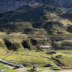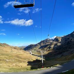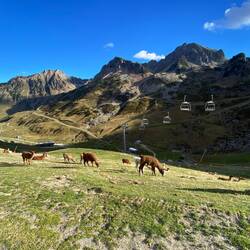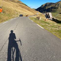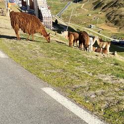 A Patrícia e o Boni ficaram entretidos no ‘bem bom’ enquanto o Cédric pedalou, montanha acima, até ao Col du Tourmalet, (um cume com 2.115 m). Pelo caminho foi desfrutando das magníficas paisagens da cordilheira com a estrada serpenteante e vistas únicas para uma cascata, um teleférico e as pistas ainda sem neve. Foi sempre tirando muitas fotos e, pelo meio, ainda parou para deixar atravessar um rebanho (?) de lamas que por ali pastavam despreocupadas.